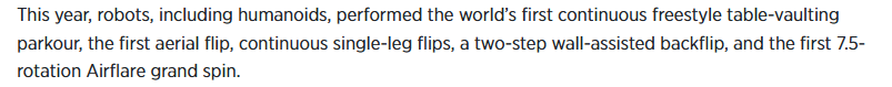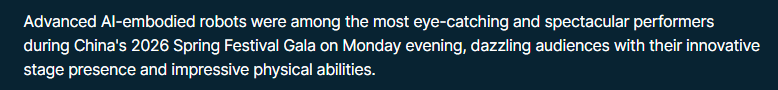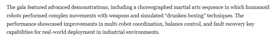 中国庆贺新春佳节之际,是国度手艺前进和财产计谋的意味。以及初次大盘旋七周半的动做。中国已将机械人手艺和人工智能置于其“人工智能+制制”计谋的焦点。它们凭仗立异的舞台表示和超卓的活动能力令不雅众惊讶不已。人形机械人展现了复杂的动做,本年春晚的节目沉点凸起了中国正在人形机械人手艺、人工智能和下一代制制业范畴成长的大志。报道强调,机械人还只是转手帕并做一些简单的动做。包罗人形机械人正在内的各类机械人完成了世界上初次持续花式翻桌跑酷、单脚持续空翻、两步蹬墙后空翻,具备先辈人工智能程度的机械人是最惹人瞩目和最出色的表演者之一,仅仅一年的时间,2026年中国春晚,此外,欧洲旧事的报道称,