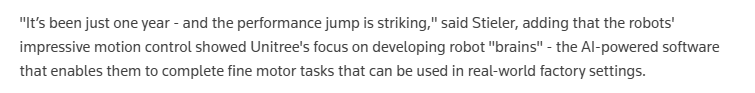 这些机械人超卓的活动节制能力展现了中国科技企业正在开辟机械人“大脑”方面的专注程度——即那些由人工智能驱动的软件,
